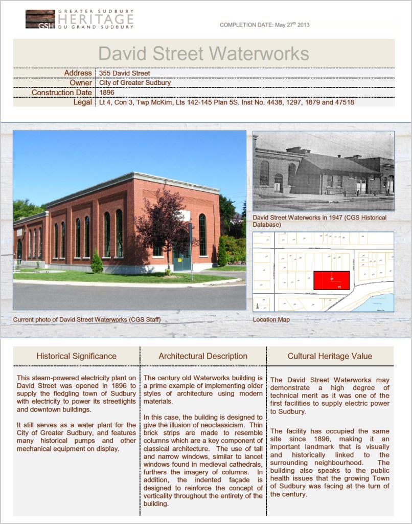 Two of these properties have been officially designated or listed as heritage sites under the Ontario Heritage Act including the Bell Mansion (1907) and David Street Water Treatment Plant (1896). A third, the former Canadian Pacific Railway Station (1907) is at the doorstep.