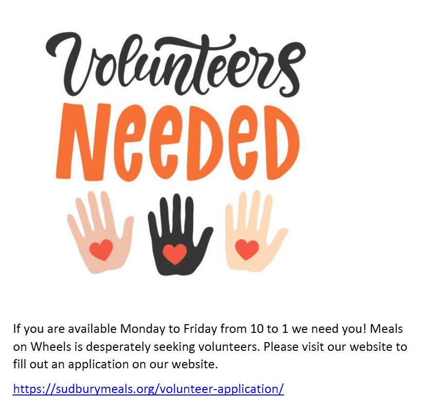 Meals on Wheels Sudbury is desperately seeking volunteers to deliver meals to area residents who depend on these services. If you can spare a few hours a week, please visit their website.