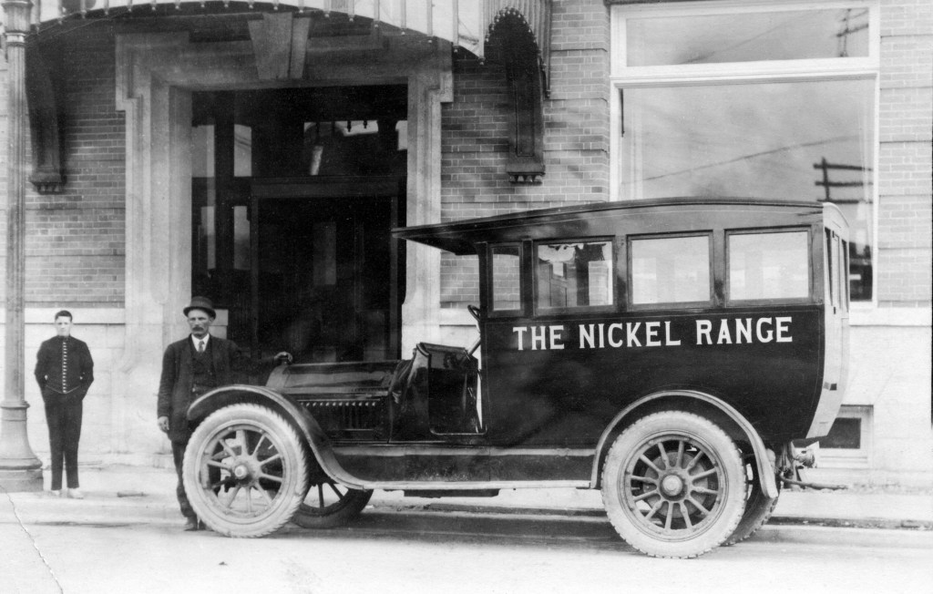 Delphis Morin standing near the entrance to his Nickel Range hotel on Elm Street in 1917. Nickel Range Bus